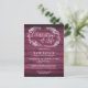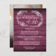 Um convite de cartão postal de celebração da vida com tema rústico, apresentando uma guirlanda de folhagem desenhada à mão sobre um fundo de painéis de madeira vermelha e foto no verso. Criado por Thisisnotme©