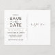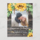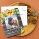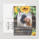 Cartão postal de salva data de casamento rústico único apresenta lindo buquê de girassóis ao longo da parte superior com pequeno buquê no canto inferior direito, sua foto favorita, tipografia caligráfica moderna e script sobreposta à impressão de madeira escura. Personalize o verso do cartão postal.