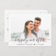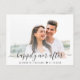 Cartão postal de anúncio de salvar data moderno e sofisticado com a sua foto sobreposta com "feliz para sempre" em um estilo de letra com floreios e seus nomes e data de casamento unidos por um coração. No verso, personalize sua mensagem de salvar data em tipografia elegante e adicione seus nomes em um estilo de letra semelhante a uma assinatura.