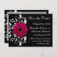 Coleção de correspondência elegante e elegante apresenta fundo preto com roldanas sutis, e um design de primeiro plano rodoso branco vívido com flor rosa brilhante da margarida gerbera, fuchsia magenta magenta gerbera. Muito elegante para um casamento no inverno, casamento de verão ou qualquer estação.