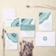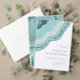 Nem todos os designs de casamento são criados iguais. Os layouts assimétricos das peças deste impressionante conjunto de casamento provam que isso não é uma coisa ruim! Faixas onduladas de cor em tons contrastantes de azul-teal e rosa-bege com um centro de cristal cintilante formam um acento de geodo/ágata na maioria das peças do conjunto. O cartão-postal de "Obrigado" do casamento mostrado aqui apresenta o acima, além de um modelo para adicionar sua mensagem pessoal, nomes e data do casamento. O verso apresenta um fundo abstrato coordenado que lembra pedra com veias de brilho. Pesquise ID647 para ver todas as peças coordenadas deste conjunto.