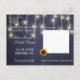 Girassóis amarelos dourados, rosas vermelhas borgonha, cordas de luzes cintilantes e tipografia branca em quadro negro elegante azul-marinho escuro foto nova data adiado cartão de anúncio de casamento. +++++++++ Fácil de personalizar com seus nomes e texto! ++++++++++ Adequado para casamentos florais de inverno, Natal, final de verão ou outono / jardim quintal rústico ou tema de casa de fazenda.