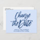 Elegante anúncio de adiamento ou mudança de data de casamento em mármore branco e brilho, apresentando uma tipografia moderna com letras que dizem "Mudar a data" em brilho azul cintilante sobre um fundo azul pálido glamoroso. Para solicitação personalizada, escreva para citronelladesign@gmail.com