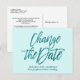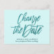 Elegante Anúncio de Adiamento ou Mudança de Data de Casamento com uma letra elegante e moderna dizendo "Mudar a data" em brilho cintilante turquesa sobre um fundo aqua sofisticado. Para solicitação personalizada, por favor escreva para citronelladesign@gmail.com