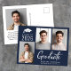 Cartão postal de marinho azul escuro moderno, com 3 fotos e "Formando" em um roteiro branco negrito contemporâneo. Adicione o nome do formando, ano de aula e segundo grau ou faculdade em tipografia branca simples.