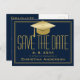 Isso permite salvar o cartão-postal de data para segundo grau ou formandos com um design minimalista com tipografia moderna em ouro falso em azul marinho com boné de formatura de ouro. O design tem uma borda dourada que adiciona um toque de elegância. A frente lê 'Salvar a Data, (sua data de formatura), para comparecer à graduação de (seu nome)."A parte de trás do cartão tem todos os detalhes da sua graduação em ouro falso com convite de festa em fundo azul. Projetado apenas para você pelos artistas ©Susan Coffey e Tim Coffey.