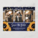 Lindos cartões-postais rústicos de salva data de casamento azul navy e girassol com 3 molduras de fotos com burlap e renda, luzes de corda e flores de girassol em um fundo de madeira de celeiro. Perfeitos cartões-postais de salva data para o seu casamento rústico azul navy no campo, quintal ou celeiro inspirado em girassóis. Personalize facilmente esses cartões-postais de salva data azul navy com suas fotos e detalhes do casamento.