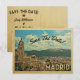 Vintage Madrid Salve os cartões postais Data com uma vista de cidade com montanhas ao fundo. Este legal design do século médio é a maneira perfeita de reunir convidados para o seu casamento de destino da Espanha de Madrid.