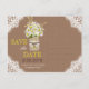 Sobreposição de renda branca em um fundo com aparência de aniagem com um buquê de margaridas em um jarro de pedreiro envolto em aniagem, renda e laço de corda cartão postal de save the date rústico country western.