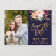 Neste outono floral, salve a data em que o cartão postal fotográfico é perfeito para um casamento outono. Personalize a frente do anúncio com sua foto de noivado favorita, seus nomes e sua data de casamento. Personalize a parte de trás com os detalhes do casamento e devolva o endereço. Nota: Este design não apresenta folha de ouro real. É um gráfico de alta qualidade feito para se parecer com folhas de ouro.