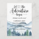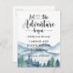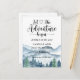 Que a aventura comece com o tema do anúncio de gravidez a aquarela apresentando floresta e montanhas paisagem selvagem com tipografia de escrita de caligrafia com coração no meio.