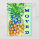 Diga a sua família e amigos que você se mudou com este cartão postal comovente e inspirador tropical. Este design apresenta um abacaxi doce, articamente colorido com um fundo verde-claro. As palavras dizem "Nós nos movemos." Na parte de trás do cartão-postal está seu novo endereço e detalhes para você personalizar. Concebido pelo artista mundialmente famoso ©Tim Coffey.
