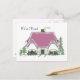 Uma casa quente e acolhedora com telhado rosa e branco mais leve do lado. Árvores e um caminho alinhado para uma porta verde. Personalize com o seu novo endereço, conforme desejado.
