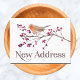 Lindo pássaro maravilhoso em um galho de árvore com frutas. Estilo de arte em aquarela com tipografia moderna. O cartão perfeito para mudança de endereço ou novo endereço para enviar a familiares, amigos e clientes comerciais.