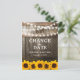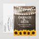 Cartão postal de mudança de data com girassóis apresentando um fundo de barril de carvalho country, luzes cintilantes, girassóis amarelo dourado, seu monograma e um modelo de aviso de data. Encontre outros cartões de mudança de planos em www.zazzle.com/special_stationery.