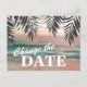 Postais de mudança de data de destino de praia com pôr do sol tropical, cenário de praia de palmeiras, luzes cintilantes e um modelo de planos de casamento novo que é fácil de personalizar.