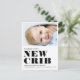 Seu bebê tem um novo berço! Design simples baseado em tipografia para um cartão postal de anúncio comovente com sua foto personalizada de bebê ou criança. Mínimo e moderno, essa mudança de endereço em preto-e-branco, facilmente personalizável, fará com que seja rápido e na moda para compartilhar as notícias de sua nova casa!