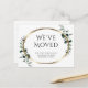 Novo endereço Cartão postal de Anúncio de Movimentação Metálica Dourada Eucalyptus... Nossa luxuosa placa de endereço botânica apresenta uma estrutura oval metálica dourada embelezada com folhas poeirentas de eucalipto verde e calypto abarrotado com esmeraldas criando uma borda natural para o texto móvel do anúncio dentro. A parte traseira do cartão contém todos os novos detalhes que sua família e amigos precisarão manter em contato. O texto de exemplo em frente e verso é exibido na coordenação da escrita elegante e da tipografia sans serif e pode ser facilmente revisado no modelo de personalização.
