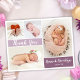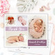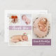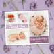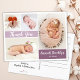Moderno, Girly Lilac e Mauve Obrigado Bebê Anúncio de Nascimento 4 Cartões-postais de Colagem Fotográfica. Modelo de anúncio elegante de nascimento de fotos com quatro (4) de suas fotos favoritas de bebês com um roteiro bonito, escrito à mão, em branco, em lilás pastel ou roxo claro e em blocos coloridos de molho ou ameixa empoeirada. Adicione o nome do seu bebê, obrigado sua mensagem e estatísticas de natalidade. Facilmente personalizá-lo.