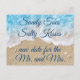 A brincalhona e divertida frase, Sandy Toes Salty Kisses nova data para os acentos de Mr. & Mrs. nesta mudança de data de casamento num fundo de água azul, areia de praia, conchas e estrelas-do-mar, tornando-o perfeito para o casamento na praia, tropical ou de destino que teve a data alterada. A parte posterior deste cartão-postal de mudança de data é ainda decorada com mais areia de praia, conchas e estrelas-do-mar. Este cartão-postal pode ser facilmente alterado para uma atualização em vez de nova data, se preferido. Se precisar de ajuda na personalização ou se precisar de itens adicionais de coordenação para o seu casamento, basta entrar em contacto connosco em prettyfancyinvites@gmail.com com o seu pedido.