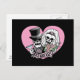 Crânios de noiva e noiva vestidos de forma mais elegante, vestidos num coração cor-de-rosa com texto RECEM CASADOS!.