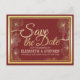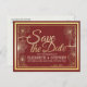 Modelos de Cartão Postal de Convite de Casamento Salvar A Data - Letreiro Elegante em Ouro e Quadro Floral Dourado Vintage em Fundo de Damasco Vermelho.