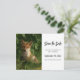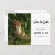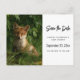 guarde o cartão-postal com uma fotografia com uma raposa-bebê fox fofa e pele vermelha e branca. Cercados por folhas e gramíneas verdes e peludas.
