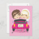 Noivo e noiva dirigindo um automóvel rosa com uma placa de recém-casados e latas amarradas no pára-choque. Celebre o seu dia de casamento com este design fofo e original do Kakigori Studio.