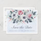 Design elegante de cartão postal de anúncio de casamento Save The Date com rosas em aquarela e folhagens em um fundo azul claro.