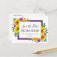 Este belo, moderno e rústico design apresenta buquês exuberantes de girassóis, rosas roxas reais e verde incluindo folhas de eucalipto e samambaias na frente. Atrás dos buquês há um retângulo violeta escuro roxo, e na frente há uma área branca de borda dourada com o texto personalizável em roxo profundo na moda, roteiro elegante e tipografia sans serif. A parte traseira da placa apresenta sobreposições florais transparentes nos cantos e texto mais personalizável, incluindo um endereço de retorno para simplificar o processo de envio. Você pode personalizar este item para seu evento especial alterando o texto no modelo do produto.