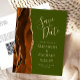 Este elegante e moderno salve a data do cartão postal apresenta uma cor de laranja queimada e ferrugem e borda agitada com falso brilho dourado. Personalizar facilmente o texto dourado sobre um fundo verde-oliva. No verso, edite o endereço de retorno personalizável e digite o URL do site do casamento para gerar um código QR que os seus convidados possam analisar para saber mais sobre o seu evento futuro.