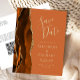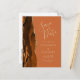 Este elegante e moderno salve a data do cartão postal apresenta uma cor de laranja queimada e ferrugem e borda agitada com falso brilho dourado. Personalize facilmente o texto claro e dourado em um fundo laranja queimado. No verso, edite o endereço de retorno personalizável e digite o URL do site do casamento para gerar um código QR que os seus convidados possam analisar para saber mais sobre o seu evento futuro.