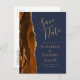 Este elegante e moderno salve a data do cartão postal apresenta uma cor de laranja queimada e ferrugem e borda agitada com falso brilho dourado. Personalize facilmente o texto dourado em um fundo azul marinho. No verso, edite o endereço de retorno personalizável e digite o URL do site do casamento para gerar um código QR que os seus convidados possam analisar para saber mais sobre o seu evento futuro.