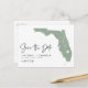 Anuncie sua data de casamento para a família e amigos com o tema do estado da Flórida salve o cartão postal do anúncio. Ele apresenta uma ilustração do estado da Flórida, uma simples tipografia e uma escrita manual. Personalize adicionando nomes, data, local e outros detalhes. Este estado verde da Flórida, salvar o cartão de data é perfeito para qualquer tema de casamento.
