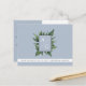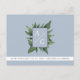 Elegante e simples cartão postal de anúncio de salvar a data de casamento em azul empoeirado com caligrafia moderna, monograma e folhagem rústica na frente.