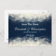 Cartão de salvar a data que você pode personalizar / personalizar com o nome da noiva e do noivo e a data do casamento. Um design abstrato elegante e sofisticado com renda de cor creme e pérolas feitas com círculos e bolhas. O fundo é azul escuro com quadrados desbotados ao lado. Design bonito e delicado.