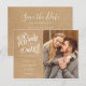 Esta foto rustic hand script salve o cartão de data e apresenta a sua foto e um script salve a data acima dos seus nomes, data e local. O inverso tem detalhes adicionais sobre a data, incluindo o site do seu casamento em um fundo kraft rústico. Projetado por Thisnotme©