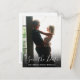 Este cartão moderno de salvar a data com foto apresenta uma foto sobreposta com um script de salvar a data acima dos seus nomes, data e local em texto branco.
