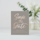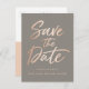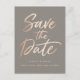 Estes cartões postais Save the Date (Salvar a data) apresentam uma fonte elegante de script em uma paleta de cores faux foil look rosa gold and cinza.