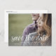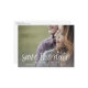 Um cartaz moderno para salvar a data projetado para acomodar sua foto favorita de noivado de sangramento horizontal ou orientada a paisagem. "Salve a data" aparece perto do fundo da sua foto em letras escritas à mão brancas, com seus nomes, data de casamento e local do casamento embaixo. Cartões postais inversos para mostrar os detalhes adicionais da data, incluindo o site do casamento, com seu endereço de retorno e espaço para o endereçamento do destinatário.