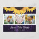 Foto de casamento Elegante, roxo e girassol, salve o cartão-postal com uma colagem fotográfica com girassóis e luzes de cordas em um fundo de madeira rústica.