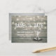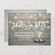 Modelos de Cartão Postal de Convite de Casamento Salve a Data - Letra Elegante, Taças de Champanhe Vintage e Luzes de Corda em Fundo de Madeira Rústica.