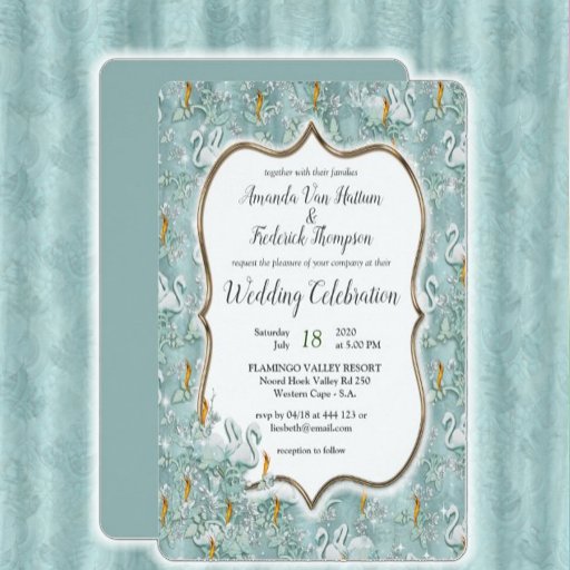 Cortinas de seda verde salvia em tons pastéis suaves com flamingos e flores brancas, chamas douradas e renda branca para um tema de papelaria personalizado para uma coleção de casamento