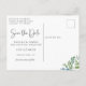 Arranjos botânicos de cor aquática modernos, casamento exceto o cartão postal. A placa apresenta uma caligrafia elegante "Salvar a Data", em frente e atrás.