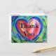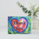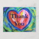 A mensagem no cartão-postal diz: "Obrigado". A pintura apresenta um coração vermelho colorido com brilhos de branco e acentos dourados. O coração é delineado em azul e tem um fundo verde suave. Esta pintura do coração é uma homenagem a manter a esperança dentro do seu coração quando os azuis tristes o cercam, mas avançando para a renovação verde.