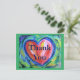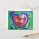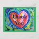 A mensagem no cartão-postal diz: "Obrigado". A pintura apresenta um coração vermelho colorido com brilhos de branco e acentos dourados. O coração é delineado em azul e tem um fundo verde suave. Esta pintura do coração é uma homenagem a manter a esperança dentro do seu coração quando os azuis tristes o cercam, mas avançando em direção ao verde renovador.