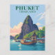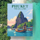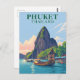 Fugir para as praias deslumbrantes de Phuket, Tailândia, com este cartão postal de ilustração estilo vintage. Com barcos de cauda longa, palmeiras e barco, este cartão postal colecionável evoca a beleza eterna da localização tropical da Tailândia