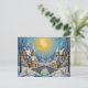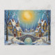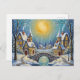 Sob o brilho suave de uma lua cheia, uma vila ingênua e aconchegante se aninha silenciosamente em uma paisagem nevada. Uma ponte de cor de tijolo arqueia sobre um riacho que flui suavemente, sua superfície brilhando ao luar. Ao seu redor, telhados cobertos de neve se destacam através das árvores, com fumaça saindo suavemente dos topos das chaminés. As casas brilham suavemente por dentro, lançando uma luz dourada sobre a neve ao redor, a cena é cheia de paz e cor.