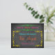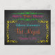 Cartão postal de Bat Mitzvah com fundo estilo quadro negro e texto em verde néon, rosa, laranja, amarelo e aqua e pergaminhos.