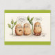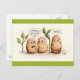 Engraçado Pun sobre Batatas. Um desenho de três batatas. A primeira pergunta: Por que somos chamados de batatas? Não temos dedos. O 3º tem pés grandes com dedos grandes e diz: Fale por vocês mesmos. borda de fundo do verde limão. Batatas marrons bonitas e divertidas penduradas no jardim. Design de desenho de desenhos animados. Desenho de Irony Design Donna Léger. Todos os Direitos Reservados.